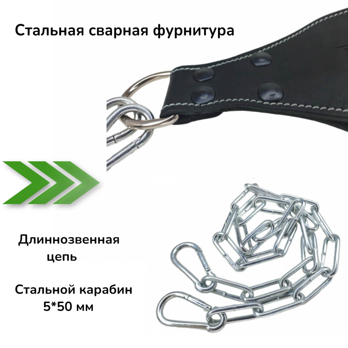 Производство: Россия Комплектность: шт Применяется как дополнительное приспособление на атлетический пояс для подвешивания отягощений. Изготовлен из толстой кожи (КРС). Полукольцо цельносварное диаметром 5 мм, цепь длиннозвенная диаметр 4 мм, стальной карабин диаметр 5 мм. Нагрузка на цепь - до 100 кг